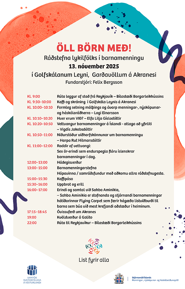 Öll börn með! er að taka á sig skemmtilega mynd, frábærar viðtökur frá ykkur og við spennt að leggja lokahönd á dagskrána. Dagurinn er hugsaður sem stefnumótandi fyrir barnamenningu í landinu en ekki síður sem notaleg samvera.